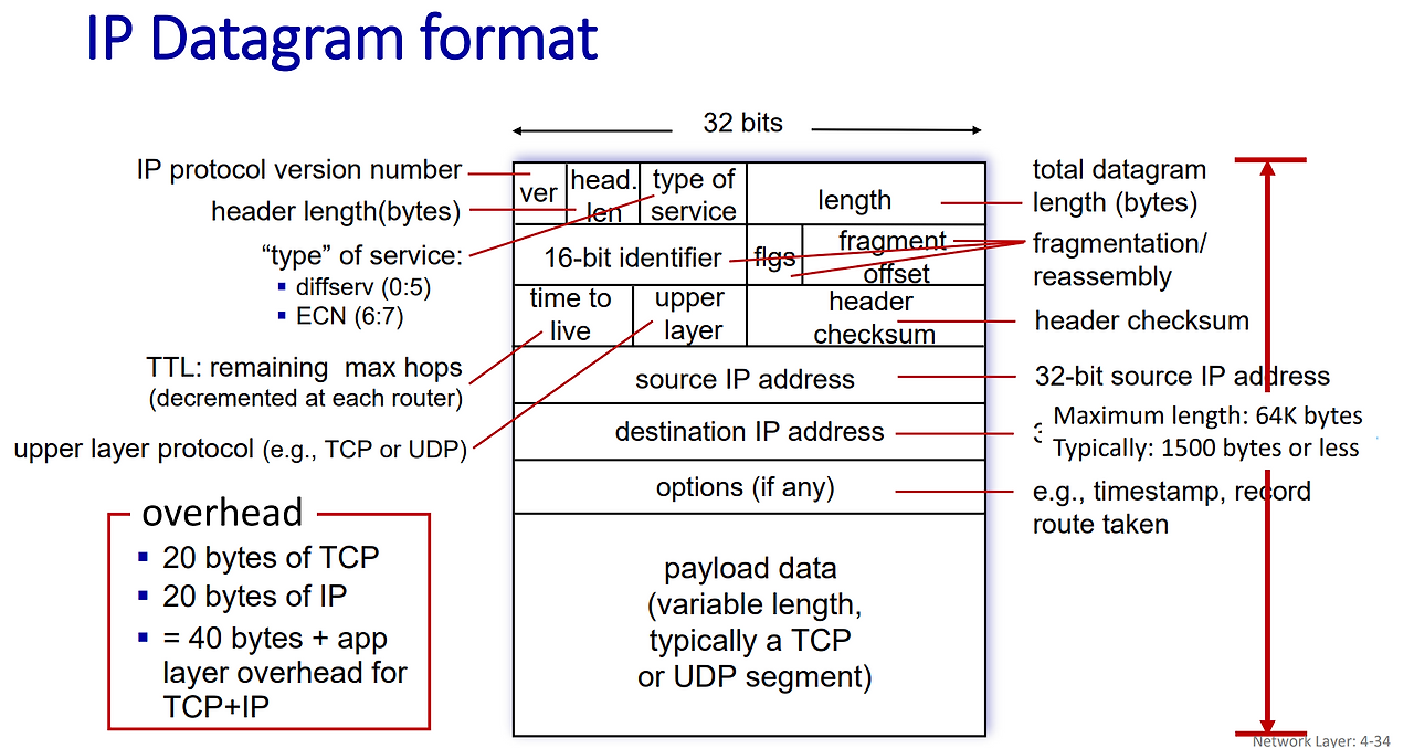 - IP Datagram의 Format은 위 사진과 같이 생겼다.