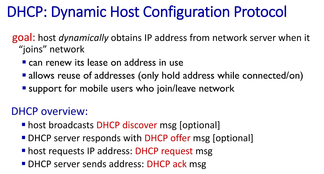 - 2. 이를 받은 DHCP 서버는 ACK를 IP주소와 함께 보내고, 이제 클라이언트는 자신이 배정받은 IP주소와 DNS 서버의 주소, 그리고 first-hop router의 주소를 알게 된다.