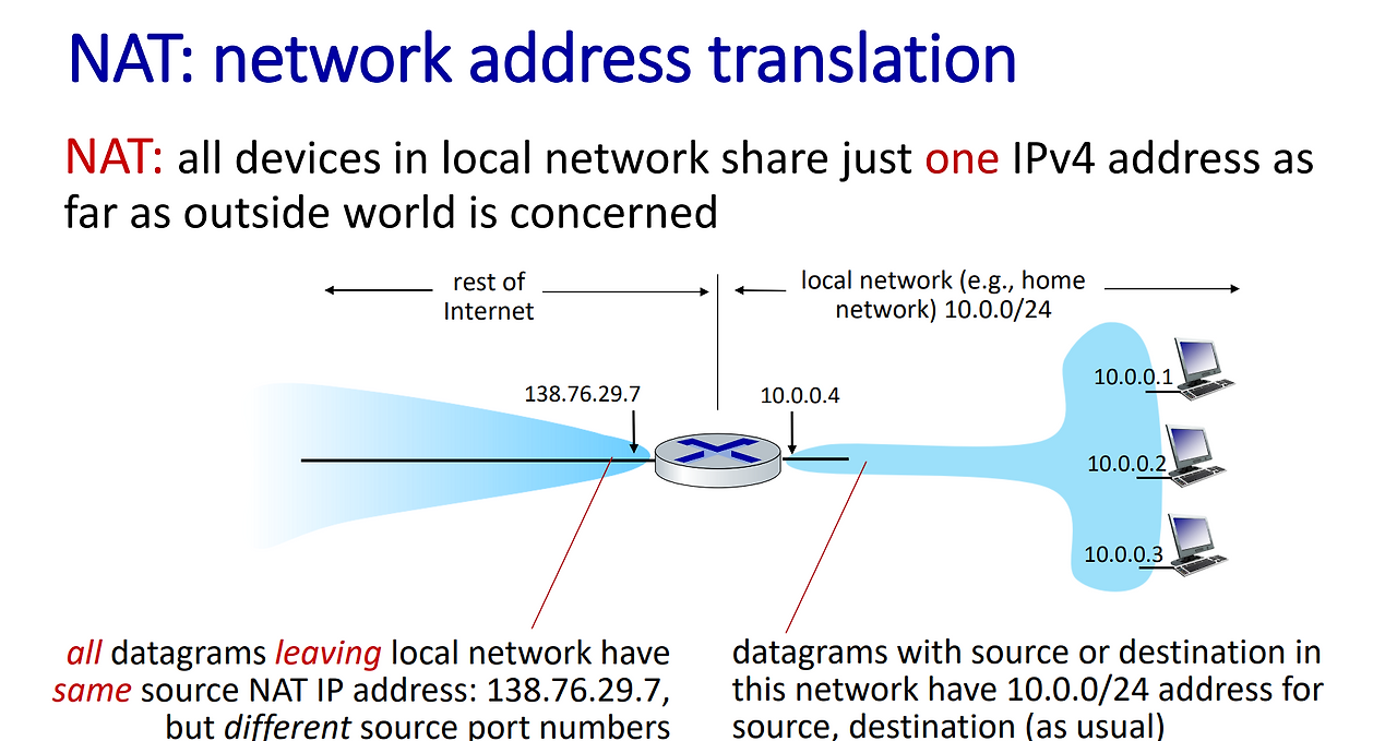 - 3. 라우터로 들어오는 Datagram애 대해서는 반드시 (NAT IP, new Port) -> (Source IP, Port)와 같은 과정을 거쳐야 한다.