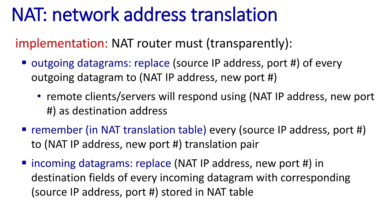- 1. 라우터에서 나가는 Datagram에 대해서는 반드시 (Source IP, Port) -> (NAT IP, new Port)와 같은 과정을 거쳐야 한다.