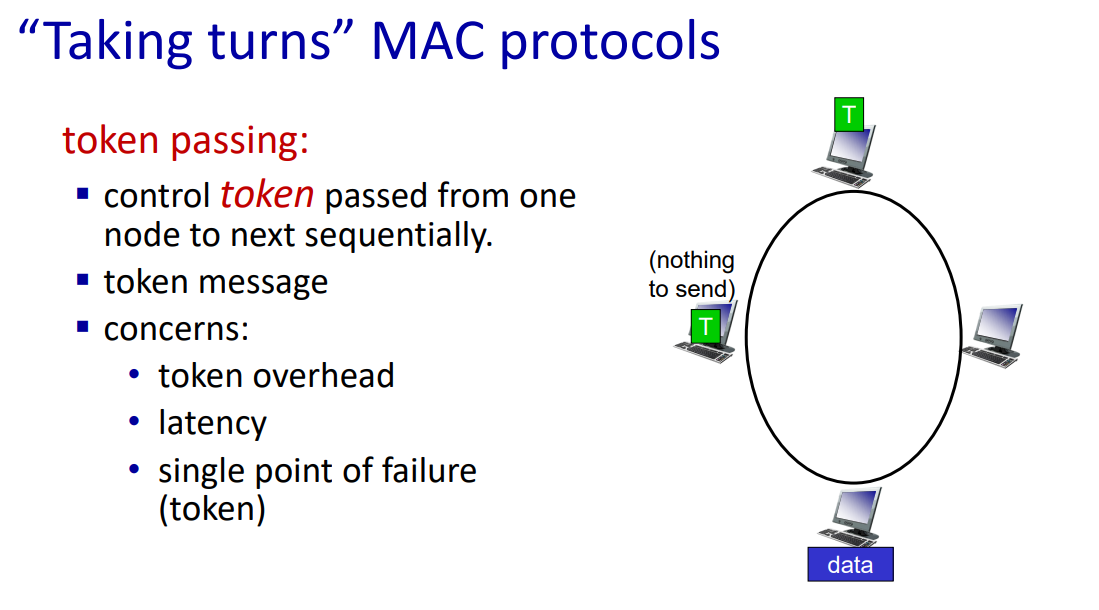 - Token Passing 방식의 Taking Turns Protocol은 진짜 말그대로 통표 폐식 방식이다. 토큰을 만든 다음에 해당 토큰을 가진 Client만이 패킷을 보낼 수 있고, 보내고 나면 순서에 따라서 토큰을 다른 클라이언트에 던지게 된다.