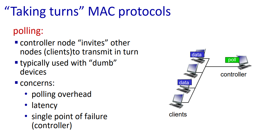 - Polling 방식의 Taking Turns MAC Protocol은 다음과 같이 동작한다. 중앙에 Controller가 하나 있고, 그 Controller가 어떤 Node가 해당 차례에 데이터를 보낼지 결정한다. (그래서 대게 "멍청한" 디바이스들의 모임에서 쓰인다.)