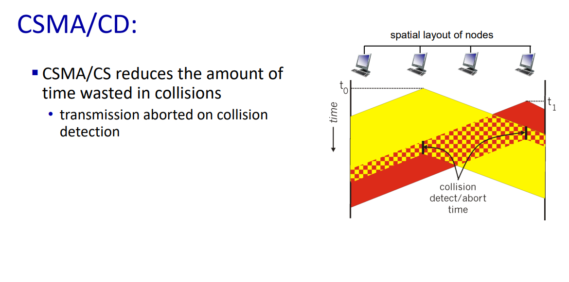 - 먼저 NIC가 채널을 감지했을때 텅 비었다 싶으면(느끼기에) 프레임 전송을 시작한다. 이때 전송중 만약 NIC가 Collision을 감지하게 된다면, Abort 하게 된다. 그리고 나서는 Binary Backoff 시간을 가지게 된다. (Binary Backoff Interval: 0, 1, 2, ... 2^m 중 숫자를 하나 골라서 K*512 bit의 시간 만큼 기다리는것) 그리고는 Collision이 사라지면 다시 NIC가 채널의 유휴 유무를 판단하게 된다. (만약 Collision이 계속 발생한다면 Backoff Interval이 늘어난다.)