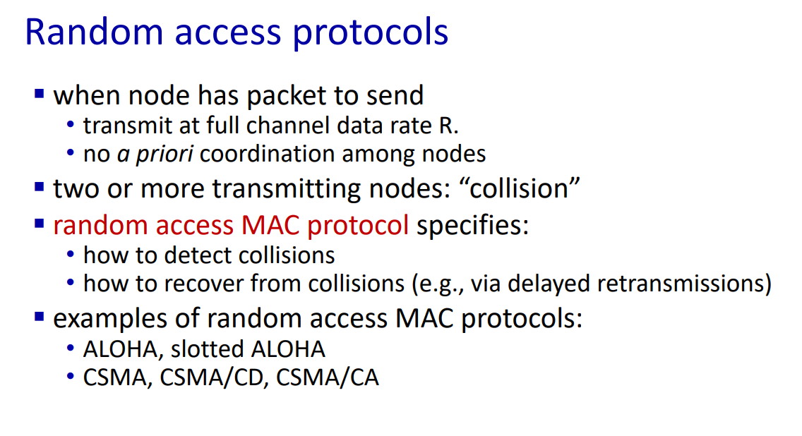 - Random Access Protocols은 한마디로 요약하자면, 진짜로 확률적인 개념으로 특정 패킷을 보낼 지 말지 결정하는 (Random) 모시깽이인 셈이다. 아래 ALOHA/slooted ALOHA의 예시를 들어 이해해 보자.