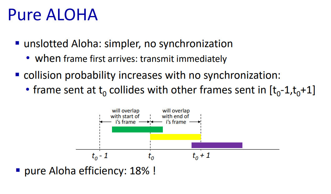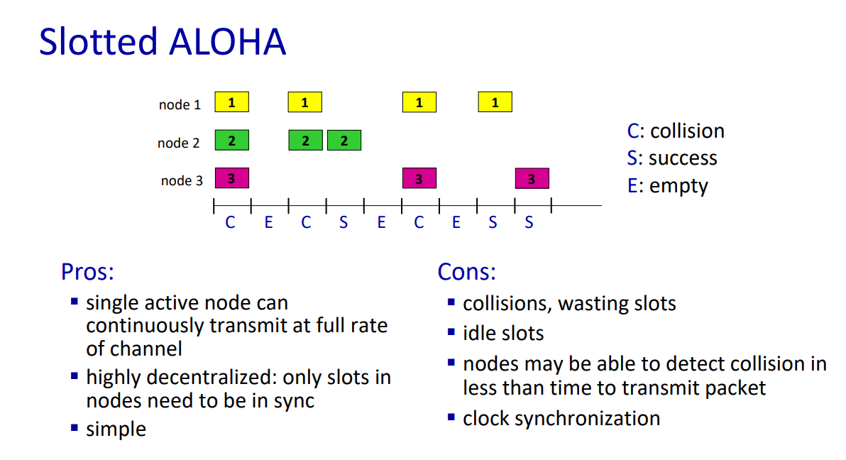 - 먼저 모든 프레임은 같은 크기를 가지고 있다고 가정하고, 시간은 일정한 슬롯으로 쪼개진다. 각각의 노드들은 동기화 되어 있다고 할때, 만약 Collision이 없으면 노드는 다음 프레임을 다음 차례의 슬롯에 던진다. 하지만 Collision이 존재하게 된다면 node는 p의 확률로 다음 프레임을 다음 차례의 슬롯에 던진다.