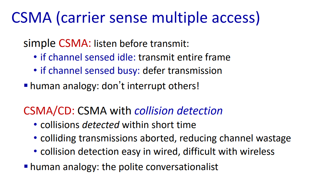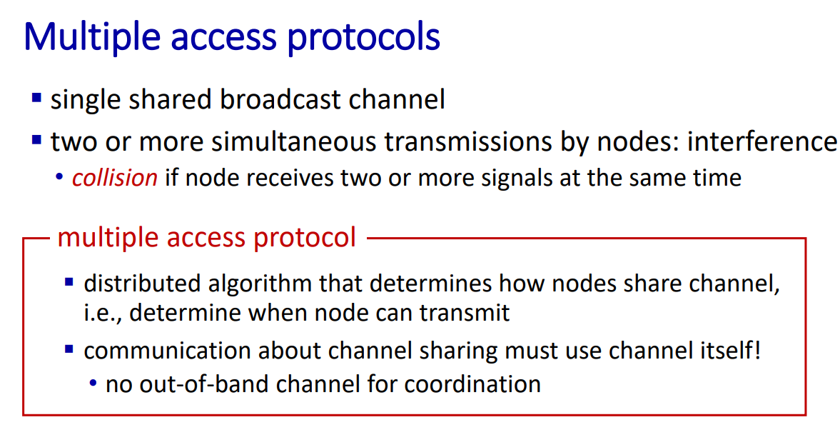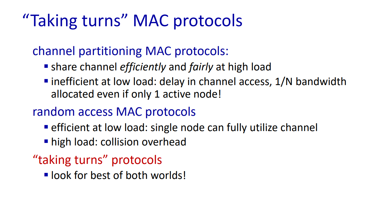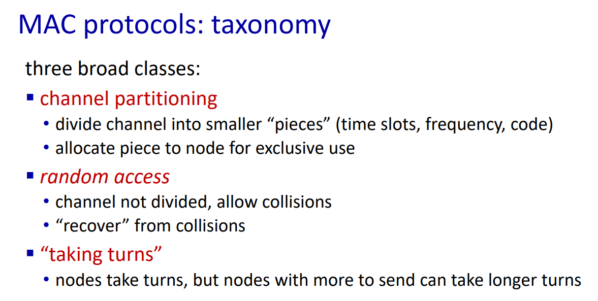 MAC Protocol에는 Channel Partitioning, Random access, Taking turns가 존재한다.
