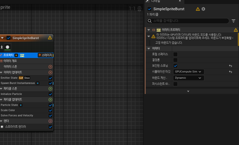 - 다만 단순히 GPU로 변경하게 되면 괴상한 오류가 뜨게 되는데, 해당 문제는 바운드 계산 탭을 Dynamic -> Fixed로 바꾸어 주면 해결 되는 문제이다. (아니면 CPU 가 GPU에서 생성된 파티클의 바운드를 알 수 없다.)