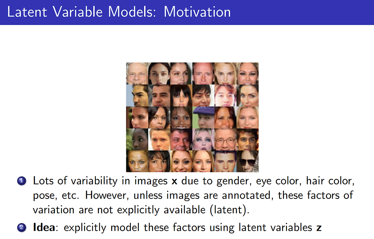 - 사람의 얼굴을 모아둔 이미지가 있다고 치면, 그 이미지에는 다양한 변수들이 영향을 미쳤을 것이다. 성별, 눈 색깔, 머리 색깔, 포즈, 조명 등등. 그러나 이러한 특성들이 따로 기록되어 있지 아니한 한, 이미지에서 "잠재적으로" 나타날 뿐이다.