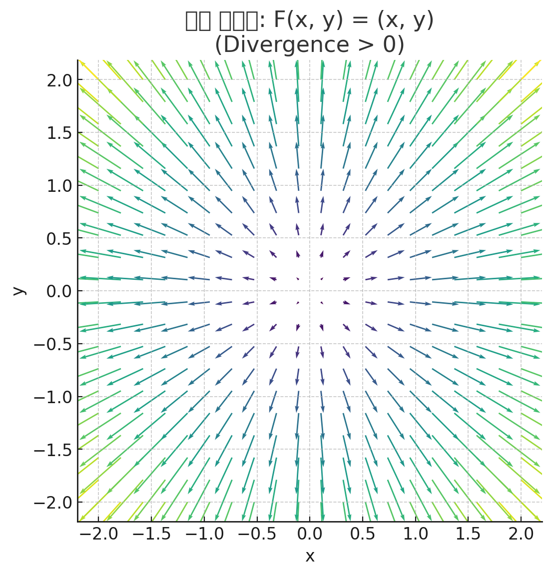 Divergence는 발산이라는 뜻을 가지고, 아마도 기초 미적분학에서는 무한급수의 수렴/발산 판정법을 다룰때 들어 봤을 것이다. 물론 Vector Field에 대한 Divergence는 수렴/발산을 말하는 건 아니고, 임의의 한 점이라는 엄청 작은 공간 (자세한건 해석학 전공한 교수님께 물어보는 것이 좋을 것이다.)에서 벡터장이 퍼지는지(위 그림을 보면 이해가 될 것) 아니면 모이는지 정도를 측정하는 것을 의미한다.