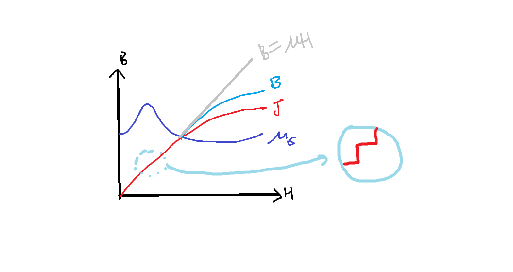 자고로 자성체가 내보낼 수 있는 자기력선은 정해져 있는 만큼, 이론상 자화의 세기는 H가 늘수록 비례하게 되어 있으나 실제로는 그러지 아니하고 중간에 포화됩니다. 그리고 바크하우젠 효과에 의해서, 자화의 정도는 계단식으로 증가되게 됩니다. 쨋든 결론은