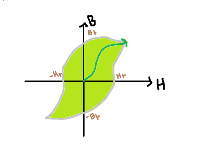 이를 히스테리시스 곡선이라고 합니다. 위 그래프에서 기울기는 (당연히) 투자율이 될 것이고, 면적은 체적당 히스테리스 손실이 될겁니다. 다시 말해서, 자화하는데 쓰인 에너지가 되겠죠. 단, 이는 위 그래프에서 B_r이 잔류자기(외부 자계가 0이어도 남는 자속밀도) / H_r가 보자력(자화된 자성체 내부를 0으로 만들기 위한 외부 자계의 세기)를 가리킬 때의 이야기입니다.