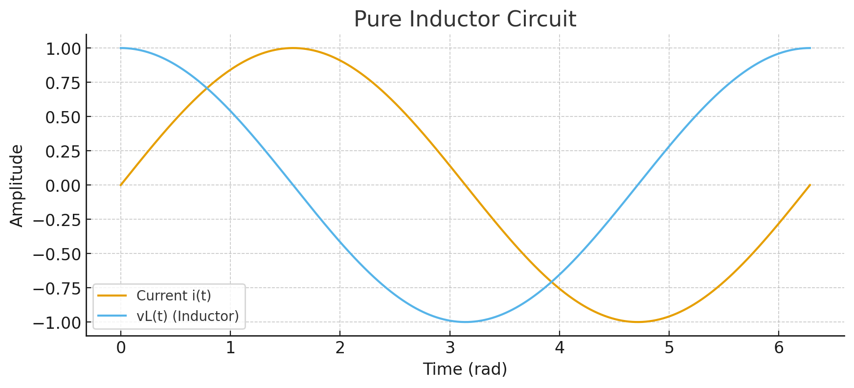인덕터는 전류 변화에 저항하는 존재(완충기)이고, 커패시터는 전압 변화에 저항하는 존재입니다. 따라서 L 단독 회로에 AC 전원을 주면 -  인덕터에 걸리는 전압에 비해서 전류가 1/4주기 정도 밀립니다. 반면 C 단독 회로의 경우에는 AC 전원을 주면 - 커패시터에 걸리는 전압에 비해서 전류가 1/4주기 정도 빨라집니다. 이를 수식으로 표현하면 대강 아래와 같습니다.