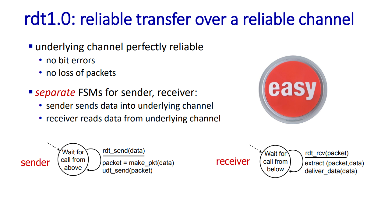 - 기본적으로 (외계인이 만든 하이테크놀로지던 간에) 신뢰 가능한 채널이 있다고 가정하므로, rdt 1.0의 구조는 단순하다.
