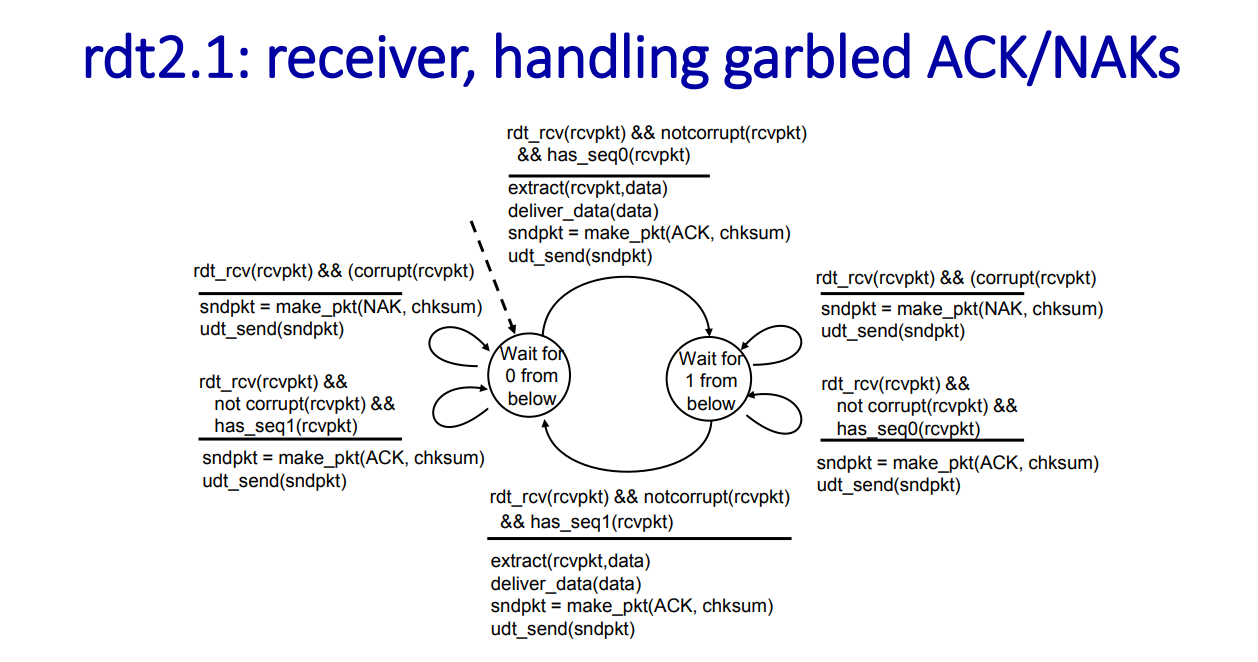예를 들어서도 이해가 잘 안될 수 있는데, ACK에 에러가 나는 상황을 생각하면 편하다. (애초에 rdt2.0, 2.1은 패킷 에러를 상정한다! 유실이 아니다!) 저 위에서는, 만약 패킷0을 받고 ACK0을 보내다가 ACK0가 엉망진창이 되서 ACK1이 됬다고 해보자. (Bit Flip, Error, Etc...) 그러면 Sender는 다시 ACK0을 보낼 것이니, 이제 어느정도 이해가 될 것이라 믿는다.