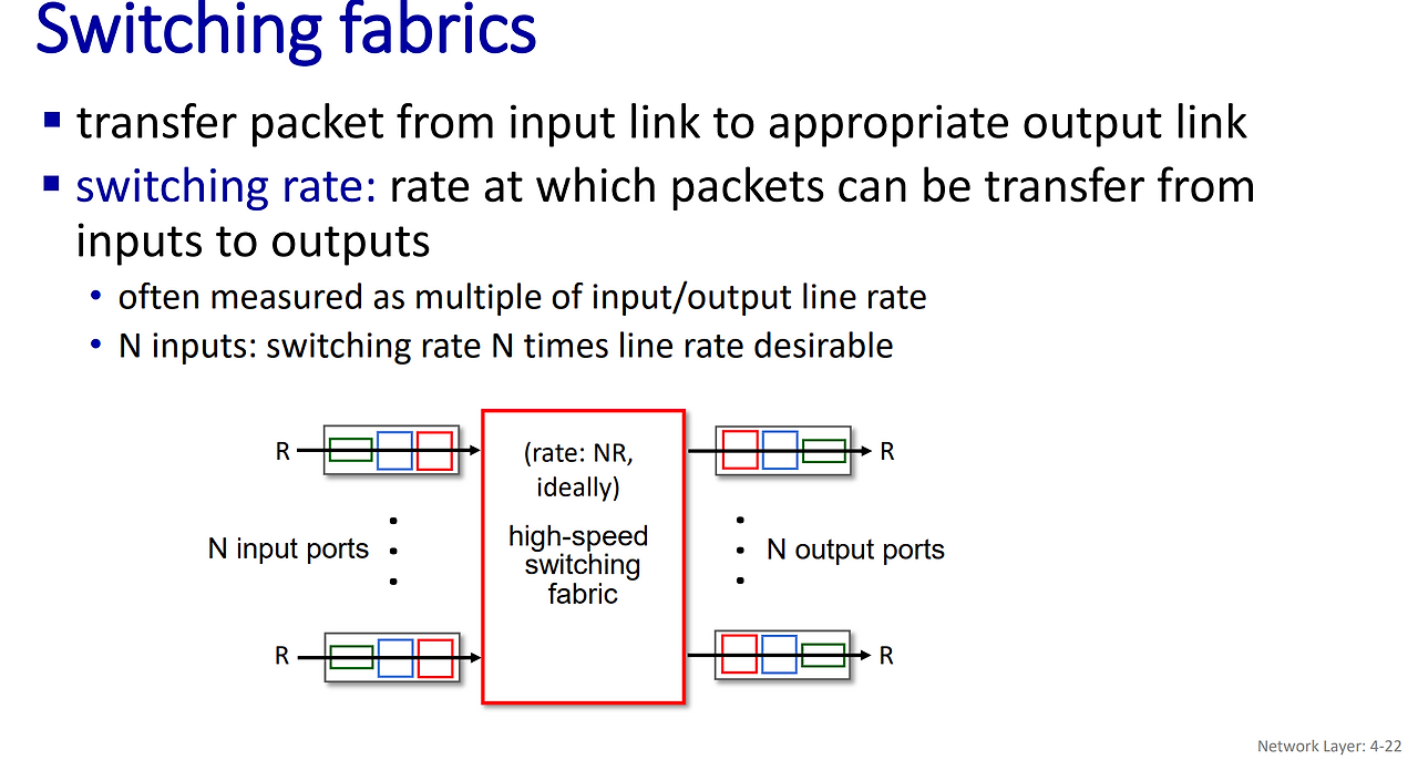 - High-speed Switching fabric은 하드웨어 단에서 ns단위로 동작하며, 어떤 라우터의 input port에 들어온 데이터그램을 outputport에 던지는 역할을 한다. 쉽게 말하면, Data Plane의 영역을 담당한다.