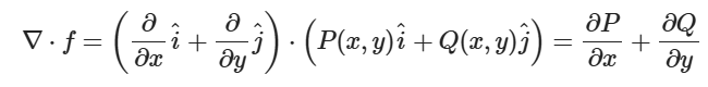 엄청 작은 미소영역 dy*dx가 있다고 하면, 여튼 x축 방향으로의 벡터 유입/유출 및 y축 방향으로의 벡터 유입/유출만 생각하면 된다. 영역인데 왜 2축만 다루냐 하면은, "미소영역"이라는데 주목했으면 좋겠다. 어쨋든 벡터의 발산량 자체는 각 축에대한 (유츌량-유입량)의 합이 될것이고, 벡터 함수 f(x,y) = P(x, y)*i + Q(x, y)*j라 하면 미소영역의 발산량은 편미분의 정의 ∂P/ ∂x + ∂Q/ ∂y가 될 것이다. 저게 뭔소린지 모르겠다면, 편미분에 대해서 다시 공부하고 오시라.