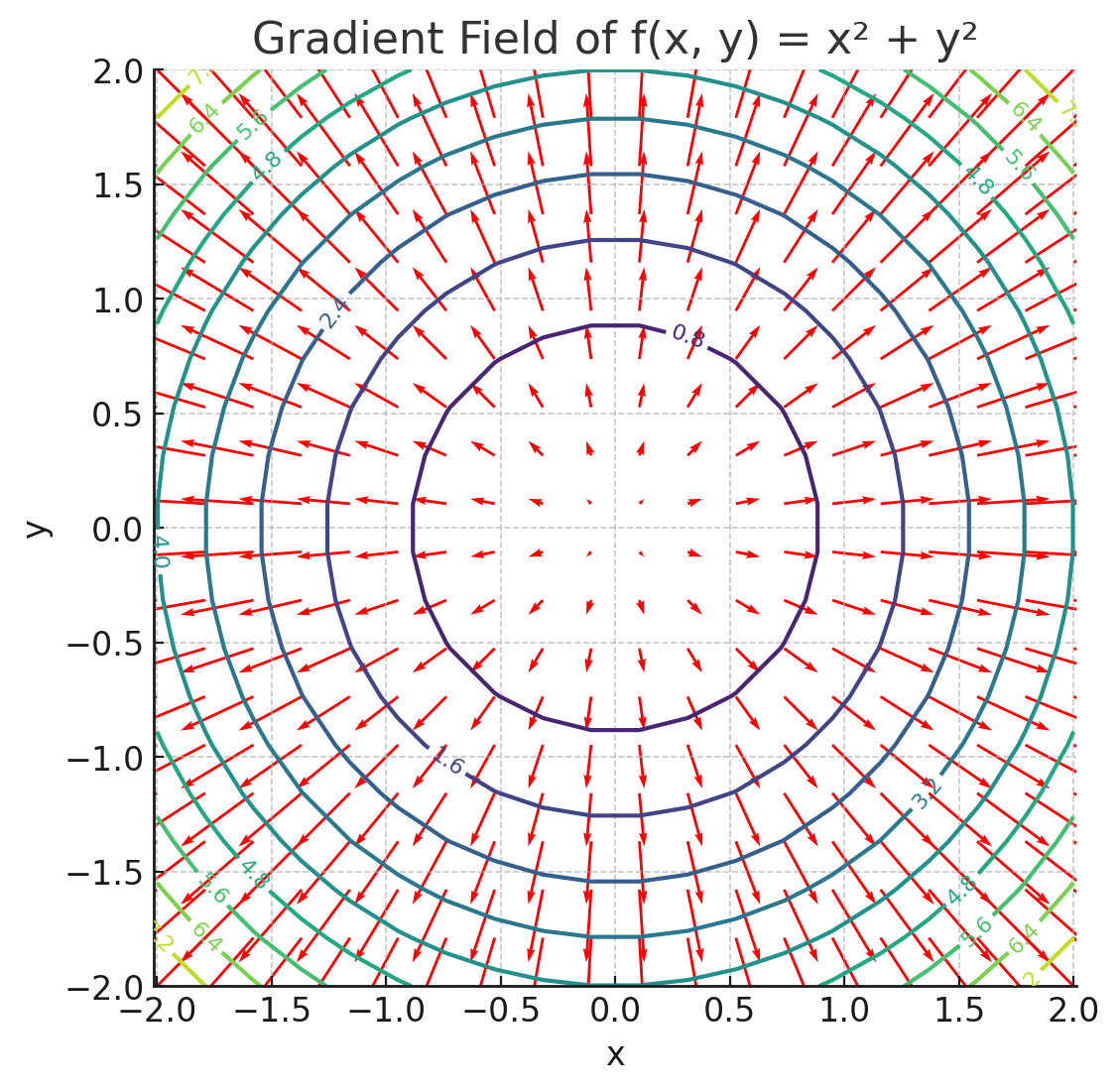 참고로 x축 편미분에 대한 벡터와 y축 편미분에 대한 벡터를 더했기에 gradient 벡터들이 저렇게 나오는 것이다. 만약 f(x)의 그래프를 그리게 된다면, f(x)는 밑으로 움푹 파인 싱크홀 마냥 나올 꺼고 gradient 벡터들은 아래에서 위로 향하는 방향이 될 것이다. 이게 일반적인 통념이랑은 좀 다를 수 있는데, Gradient Vector는 "함수값이 가장 빠르게 증가하는 방향"을 가리키기 때문이다. 참고로 ML에서 주구장창 나오는 Gradient Descent는 gradient 방향의 반대로 움직이게 되는 것이다.
