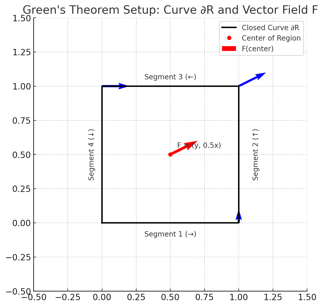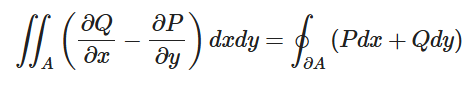 벡터장이 잘 주어져 있고(P(x,y), Q(x,y)) 선적분의 방향은 면적 A의 경계에 대한 반 시계방향이라고 하면