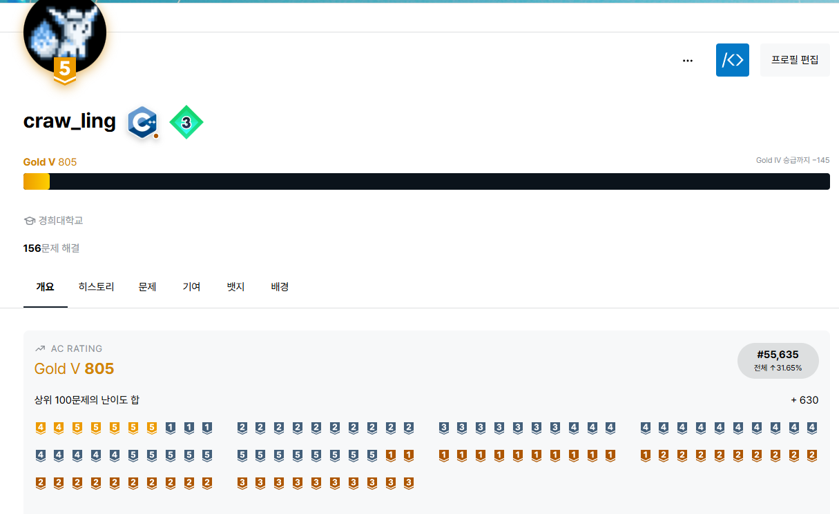 2. 물론 골드 5는 여전히 "대기업식 코테"에 비하면 많이 부족한 수준이고(애초에 2학년 마치고 휴학중이다.), 내 장기적인 목표는 아마 플래티넘 어딘가 일 것 같으나.. 그때쯤이면 AI가 이미 내 일자리를 대체하고 있을거 같아서 좀 슬프긴 하다.