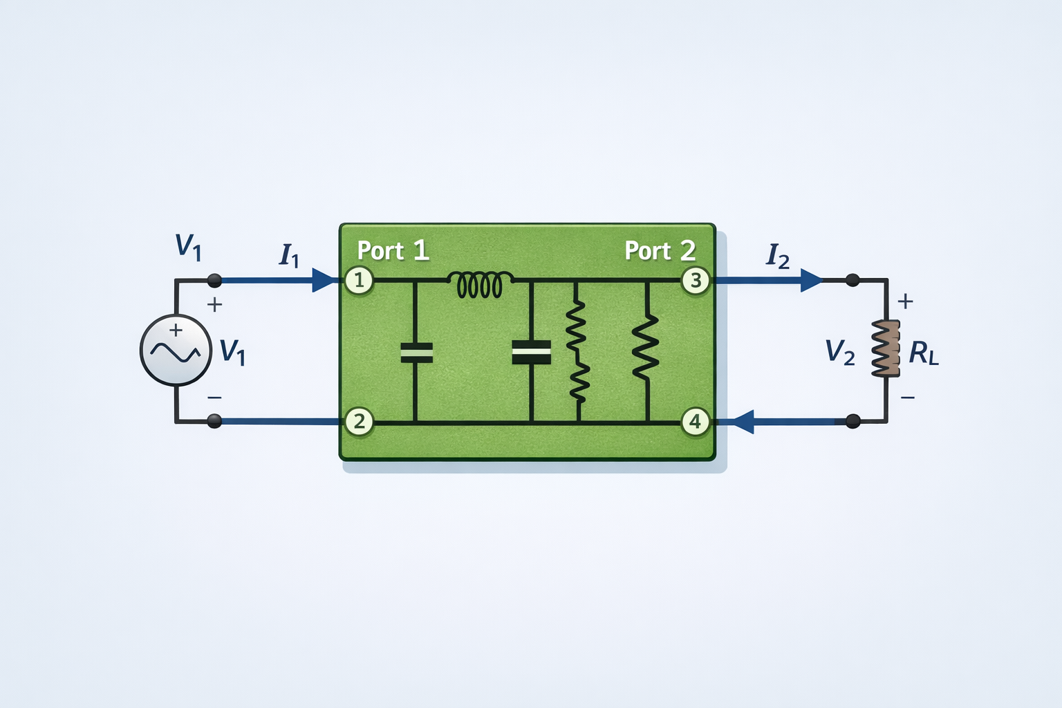 4단자 회로는 임의의 수동 선형 회로망에서 외부로 나온 단자가 4개(송신2 + 수신2)인 회로망을 말합니다. 그리고 이에 대한 분석은 크게 4개의 파라미터로 나눠 볼 수 있습니다.